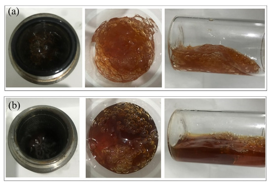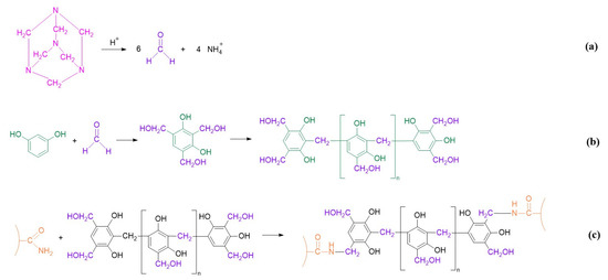 The resorcinol/HMTA-based polymer gel system is formed by cross-linking HPAM with the product of resorcinol and HMTA. The reaction processes are illustrated in Figure 1. Firstly, HMTA was gradually decomposed into formaldehyde with the aid of an acidic catalyst (Figure 1a). Secondly, formaldehyde reacted with the phenolic hydroxyl groups originating from resorcinol and formed into oligomers of phenolic resin (Figure 1b). Subsequently, the –CH2OH in the phenolic resin cross-linked with the –CONH2 in HPAM to form a bulk gel (Figure 1c) [40].