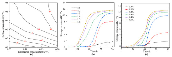 As is known, the gelation time and the gel strength are key indicators for gas mobility control. The contour map revealing the effect of the concentrations of resorcinol (0.05–0.2 wt%) and HMTA (0.1–0.6 wt%) on the gelation time is represented in Figure 2a. According to Sydansk and Southwell, low molecular weight polymers (<2 million) are typically employed to treat <200 mD permeability reservoirs [41]. In our previous work, only a few commercial polymers with a molecular weight of less than 2 million were available, and a mass of polymer was required to form a strong bulk gel, resulting in higher costs. Hence, a commercial HPAM with a molecular weight of 2 million was optimized to ensure an excellent injectivity and a strong strength polymer gel. Moreover, the concentration of HPAM was fixed at 0.5 wt%. To catalyze the gelation reaction, 0.2 wt% acetic acid was introduced into the gelant. Acetic acid is a weak acid compared to hydrochloric acid and relieves the damage to reservoirs. According to Figure 2a, increasing the concentration of resorcinol or HMTA shortened the gelation time. Noteworthily, HMTA played a much more important role in promoting the gelation process. Therefore, to further explain the influence of HMTA on gel strength, the relationship of the storage modulus (G′) of gels with the aging time, as well as the dosage of HMTA, was explored. The concentration of resorcinol was fixed at 0.1 wt%. The mass ratio of resorcinol to HMTA varied from 1:1 to 1:6. As displayed in Figure 2b, when the mass ratio of resorcinol to HMTA was 1:1 or 1:2, a weak gel was formed with a much slower gelation rate. As the mass ratio of resorcinol to HMTA increased to 1:3 or more, the gelation time was shortened, and a bulk gel was formed within 60 h, with a G′ of more than 10 Pa. Previous studies suggested that the reasonable mass ratio of phenol to HMTA is 1:1 in high-temperature reservoirs [38]. However, for the low temperature of 42 °C, HMTA needs to be superfluous in order to decompose into sufficient formaldehyde, which facilitates the following cross-linking process. Moreover, the gelation rate is highly dependent on the concentration of acetic acid, as exhibited in Figure 3c. The gelant could not form into gels within 96 h by employing less than 0.1 wt% acetic acid, as only a small quantity of formaldehyde was generated from the decomposition of HMTA. When the addition of acetic acid increased to 0.2 wt%, the gelant was able to form into bulk gels within 72 h. Meanwhile, the gelation time was shortened at elevated acetic acid concentration, owing to the accelerated decomposition rate of the HMTA.