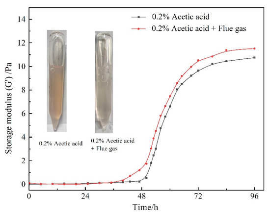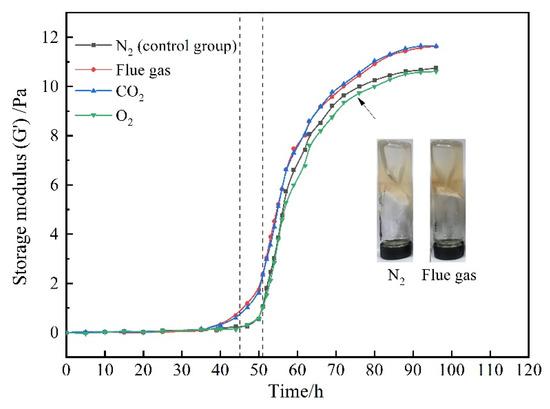 The gelants (consisting of 0.5 wt% HPAM, 0.3 wt% HMTA, 0.1 wt% resorcinol, and 0.2 wt% acetic acid) were prepared through saturation with different gases. The variation of G′ with gas species and aging time is presented in Figure 3. In view of the chemical inertness of N2, the gelant treated with N2 was adopted as the control group. In terms of the control group, the G′ of the gelant barely changed at the initial stage and then increased rapidly. The gelation time was about 51 h, and the final G′ of the polymer gel reached up to 10 Pa after being aged for 72 h. Notably, as the gelant was saturated with flue gas, the increasing rate of the gel strength sped up. The gelation time was shortened to about 45 h. Meanwhile, the gel strength was much higher compared to that of the control group. The final G′ of the polymer gel increased to 12 Pa. The flue gas positively promoted the gelation performance, as it compensates for the disadvantage of the postponed gelation process and reduced gel strength caused by the inevitable gravity differentiation and chromatographic separation in the process of gelant migration in the rock matrix.
