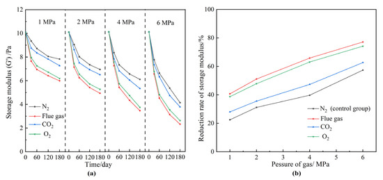 The effect of gas species and gas pressures on gel long-term stability. (a) G′ of gels at elevated gas pressures versus aging time; (b) reduction rate of gel strength after aging for 180 days.