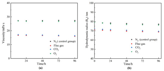 The effect of gas types on HPAM properties. (a) Viscosity; (b) hydrodynamic radius (Rh).
