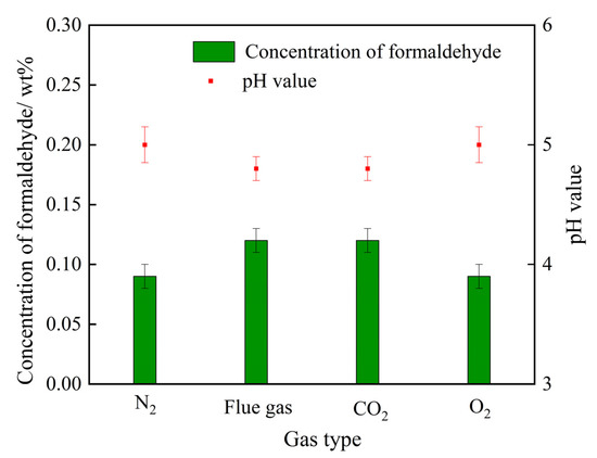 As illustrated in Figure 1, the step of the decomposition of HMTA into formaldehyde plays a dominating role in the generation rate of cross-linkers. A higher concentration of formaldehyde not only means a higher decomposition rate of HMTA, but also many more cross-linking sites and, thus, a faster cross-linking reaction rate. The variation trends of formaldehyde concentration in the HMTA solutions are explored afterwards. A series of 0.3 wt% HMTA solutions were prepared through treatment with N2 (control group), flue gas, CO2, and O2, separately. As depicted in Figure 8, O2 had little influence on the concentration of formaldehyde. By contrast, the concentrations of formaldehyde in the HMTA solutions were significantly elevated after being treated with both flue gas and CO2, signifying that CO2 in the flue gas may dominate in the decomposition rate of HMTA to formaldehyde. Compared to the HMTA solution in the control group, the pH value decreased from 5.1 to 4.8 during the flue gas and CO2 treatment. Hence, the reduction in pH was the main reason for the expedited decomposition rate of HMTA.