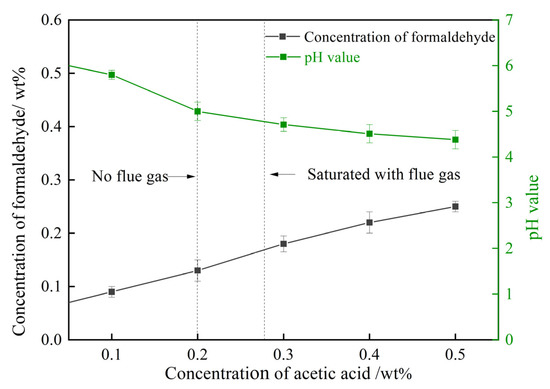 Acetic acid mainly acts as a pH-adjusting agent in gelant, triggering the decomposition of HMTA. Thus, 0.3 wt% HMTA solutions with 0.1–0.5 wt% acetic acid were prepared. The changes in pH and the concentration of formaldehyde triggered by acetic acid are studied in Figure 9. The pH value decreased from 6.2 to 4.38 as the concentration of acetic acid in the HMTA solution increased from 0 to 0.5 wt%. The concentration of formaldehyde, thus, rose from 0.07 wt% to 0.22 wt% due to the enhanced acid catalyst. As for the HMTA solution treated with flue gas, the dissolution of CO2 in the solution paralleled the increase in the concentration of acetic acid. The dissolved CO2 reduced the pH value of the gelant and expedited the decomposition rate of HMTA, thus, promoting the production of formaldehyde, which contributed to the cross-linking process.