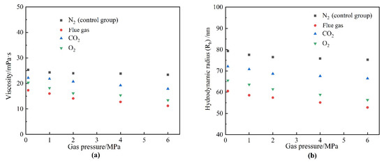 Flue gas seriously damages the gel long-term stability at elevated gas pressures and inevitably results in an increasing failure in gas mobility control. The reduction in the strength of the polymer gels might result from two reasons. On the one hand, high-pressure flue gas may impose physical damage on the polymer gel through extrusion and penetration, causing the rupture of the polymer gel, which is verified by the control group in Figure 4a. On the other hand, the dissolution of CO2 and O2 alters the chemical environment of the formation fluid and may inhibit the cross-linking process or disrupt the chemical structure of the polymer gel, which is also the key part of this subsection. To explore the stability performance of polymers, the viscosity and Rh of HPAM solutions aged for 180 days at elevated gas pressures were evaluated. The effect of gas type and gas pressure on the viscosity of HPAM is illustrated in Figure 11. Similarly, the HPAM solution treated with N2 was once again adopted as the control group. As revealed by Figure 11a, the increase in N2 pressure had little influence on the viscosity of the HPAM solution and almost stayed constant at 25 mPa·s. On the contrary, a rapid decline in viscosity occurred at elevated flue gas pressures. Meanwhile, both CO2 and O2 in flue gas inflicted serious damaged on HPAM viscosity at elevated gas pressures. Although the viscosity and Rh of HPAM decrease with the increasing gas pressure of CO2 and O2, the reasons are quite different. High-pressure CO2 led to a decrease in the pH of the HPAM solution, resulting in the further configuration alteration of HPAM molecules, rendering them curlier [23,24]. However, dissolved O2 (DO) led to oxidative degradation of HPAM and broke the polymer molecules into fragments during the long-term aging process [17,19]. These arguments are supported by the changes in the molecular weight of HPAM (Figure 12). The viscosity-average molecular weight of HPAM barely changed with the pressure of CO2, indicating that the reduction in viscosity and Rh resulted from the configuration alteration of HPAM molecules. On the contrary, the molecular weight of HPAM exhibited a drastic reduction with the increasing pressure of O2, showing that the degradation of HPAM was responsible for the reduction in viscosity and Rh. Compared to CO2, the O2 in flue gas inflicted more serious damage on the long-term stability of HPAM at elevated gas pressures.