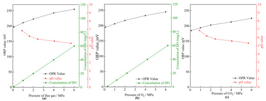 The properties of the HPAM solution in different pressures of gases. (a) The OPR value, concentration of DO, and pH value as a function of pressure of flue gas; (b) the OPR value and concentration of DO as a function of pressure of O2; (c) the OPR value and pH value as a function of pressure of CO2.