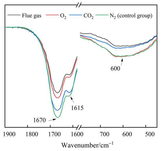 The infrared characteristic peaks of the functional groups change with the cross-linking and degradation processes of HPAM. Therefore, the effect of flue gas on the long-term stability of polymer gels can be interpreted through FTIR analysis. The polymer gels were filled with 2 MPa of different types of gases and aged for 180 days. The FTIR spectra of polymer gels are presented in Figure 14. The broad peak at 600 cm−1 observed in gels was assigned to primary amine group (–NH2) bending vibration [43]. For the resorcinol/HMTA-based polymer gel, the –NH2 groups in HPAM cross-linked with the –CH2OH in phenolic resin, resulting in a decrease in the peak at 600 cm−1 and the generation of secondary amine groups (–NH–). The peak of the gels treated with flue gas and CO2 were much lower than those of the gels treated with N2 and O2, indicating a further cross-linking reaction caused by CO2. In contrast to the control group, the absorption peaks decreased significantly at 1670 cm−1 and 1615 cm−1 in flue gas and O2 groups, respectively. Given that the stretching peaks at 1670 cm−1 and 1615 cm−1 correspond to the C=O bond in the –CONH2 group and the C-O bond in the –COO− group, respectively, the reduction in the absorption peaks can be attributed to the degradation of HPAM molecules and the elimination of –CONH2 and –COO− in HPAM [44].