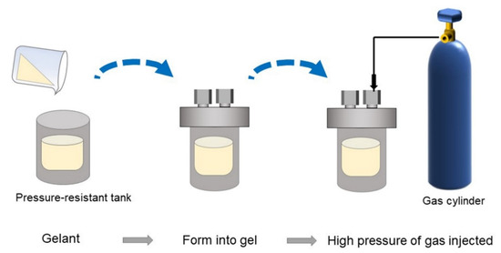 The gelants were obtained by evenly mixing HPAM stock solution with cross-linker solution, including resorcinol, HMTA, and acetic acid, in different proportions. Subsequently, the gelant samples were saturated with flue gas, N2, CO2, and O2 separately and sealed in glass bottles. Then, they were placed in a 42 °C water bath for further study. Furthermore, the long-term stabilities of gels at elevated gas pressures were also assessed. The experimental flow is depicted in Figure 16. As shown, firstly, the gelants were prepared, transferred to a pressure-resistant tank, and subsequently placed at 42 °C for a sufficient time. After bulk gel was formed, the tank was injected with different pressures of gases and set to 42 °C again for 180 days for further study.