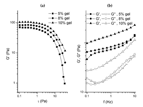 Rheological properties of chia seed hydrogels of different concentrations presented with (a) stress sweep and (b) frequency sweep curves.