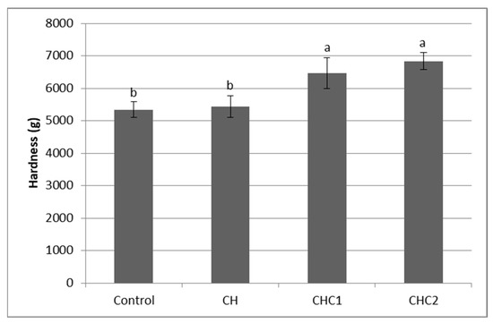 Hardness of developed reduced-fat gluten-free cookies (CH, CH1, CH2) compared with full-fat cookie (Control). Different small letters indicate statistical significance (p < 0.05).