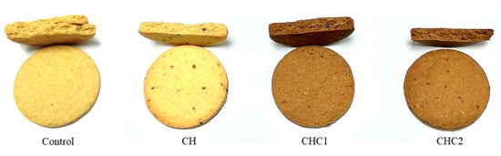 The differences between the color of the cookies, Control, and CH vs. CHC1 and CHC2 (Figure 3, Table 4) are the consequence of the difference in the composition of the gluten-free cookies, i.e., the cocoa powder addition. Among the samples with the same cocoa powder content, a statistically significant difference (p < 0.05) in parameter b* was noticed between the CHC1 and CHC2 samples (Table 4). The obtained findings can be explained with the different fat composition in the cookie preparations, where the samples with a lower fat content had a higher share of a yellow color.