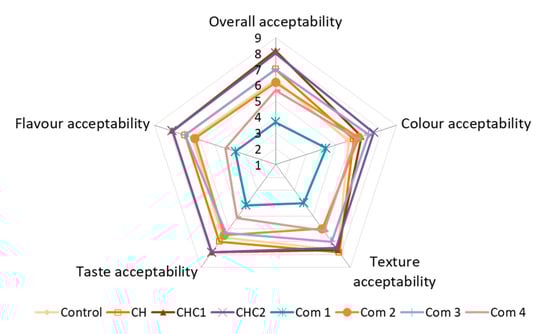 The impact of the chia seed hydrogel fat replacer on the overall acceptability and acceptability of the color, taste, flavor, and texture of gluten-free cookies, evaluated by consumers, is shown in Figure 4. The cookies formulated in this study were compared with each other as well as with commercially available gluten-free cookies. Scores for overall acceptability were in the range from 3.67 to 8.17, which means that consumers discriminated cookies from those that are disliked slightly (Com 1) to those that are liked very much (CHC1). The decrease in fat content in the produced samples did not impair the acceptability of the cookies’ texture nor flavor. A similar finding was reported by [23] who investigated the influence of a partial substitution of fat with chia gel mucilage and concluded that cookies with up to 30% fat substitution were found acceptable. However, according to these authors, higher substitution levels caused a reduction in the sensory acceptability of the cookies. The addition of cocoa powder in the gluten-free cookies’ formulation (CHC1 and CHC2 cookies) contributed to a higher acceptability of all the analyzed sensory properties, except the texture. In general, the results of the sensory analysis revealed that it is possible to apply chia seed hydrogel to produce reduced-fat cookies with sensory properties comparable to their full-fat counterparts (Control) and commercial samples (Com 2 and Com 3), and that they are far more appealing than commercial low-fat gluten-free cookies (Com 1).