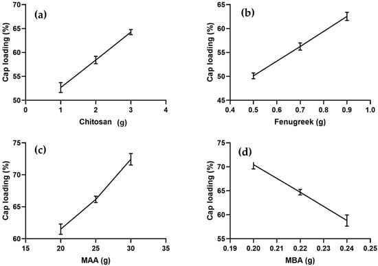 Effect of ingredients concentration on CAP loading (a) Chitosan, (b) Fenugreek, (c) Methacrylic acid (MAA) and (d) N,N-methylene bisacrylamide (MBA).