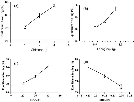 Swelling response of formulations was noted in a phosphate buffer solution with pH 7.4. The effect of concentration of chitosan, fenugreek, MAA, and MBA on swelling response was determined, as presented in Figure 2.