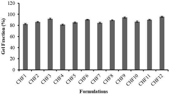 For formulations containing variable concentrations of chitosan (CHF1 to CHF3) and fenugreek (CHF4-CHF6), an increase in gel fraction was revealed, ranging from 82.55% to 91.83% and 81.42% to 90.46%, respectively. A progressive rise in gel fraction up to 94.15% was observed for formulations (CHF7-CHF9) developed by the sequential rising of MAA amount, as methacrylic acid provides an excess of carboxylic groups that have an affinity to link with reactive sites on the polymeric backbone; hence, they facilitate a polymerization reaction resulting in elevation of gel fraction.