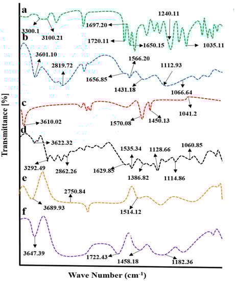IR spectrum of chitosan (Figure 4b) has revealed evident peaks at 1066.64 cm−1(CO stretching vibrations), 1112.93 cm−1 (COC asymmetric stretching vibrations), 1330.88 cm−1 (amide III peak), 1431.18 cm−1(OH bending vibrations), 1566.20 cm−1 (N-H bond bending vibration), 1656.85 cm−1 (N=C (imine bond)), 2879.72 cm−1 (asymmetric stretching vibrations of C-H), and 3601.10 cm−1 (overlapping of N-H and C-H stretching) [].