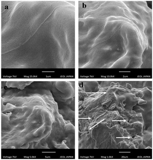 Scanning electron microscopy was conducted at 1 µm (Figure 5a), 2 µm (Figure 5b), 5 µm (Figure 5c), and 20 µm (Figure 5d) scale bar to study the surface morphology of developed drug-loaded hydrogels. Smooth surfaces were shown to have a glossy appearance. Hydrogels also exhibited pores on the surfaces, as revealed by SEM micrographs in Figure 5. Porosity in the grafted network is helpful in the absorption of biological fluid that causes swelling of hydrogel and release of CAP from the polymeric network [].