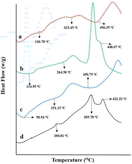 DSC spectrum of fenugreek gum presented an endothermic peak at 114.95 °C (0.006124 J/g), showing moisture removal from the gum. Two more peaks recorded at 264.50 °C (0.03039 J/g) and 379.46 °C (0.1580 J/g) depict the polymer’s melting range and decomposition, respectively. The entire combustion of fenugreek gum was noticed at 448.67 °C (0.0005067 J/g) (Figure 6b). Similarly, in the DSC thermogram of chitosan showed endothermic peaks at 90.94 °C and 251.15 °C due to water removal and melting of polymer, respectively. While peak displayed at 450.75 °C represented the entire degradation of the polymer (Figure 6c).