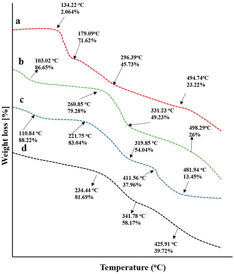 TGA thermograms of (a) capecitabine, (b) chitosan, (c) fenugreek seed extract, and (d) drug loaded hydrogels.