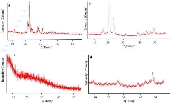 XRD diffractograms of (a) CAP, (b) chitosan, (c) fenugreek gum and, (d) drug-loaded hydrogels.