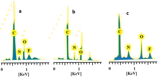 Pure CAP, unloaded, and drug-loaded hydrogels were evaluated for elemental composition by performing elemental dispersive spectroscopy. EDX spectra and percentage composition of elements for each case are displayed in Figure 9 and Table 1, respectively. Specific concentrations of carbon, nitrogen, oxygen, and fluorine (56.06%, 10.52%, 29.54% and 3.87%) were indicated by quantitative data on CAP (Figure 9a). Similarly, these elements were also identified in drug-loaded chitosan/fenugreek-g-poly (MAA) hydrogels in concentrations of 51.40%, 1.24%, 38.04%, and 9.32%, as observed in Figure 9c. In the case of unloaded hydrogels, the peak of fluorine was missing, as it is only an essential element of CAP, while carbon, nitrogen and oxygen were displayed in concentrations of 47.88%, 4.14% and 47.99%, respectively (Figure 9b).