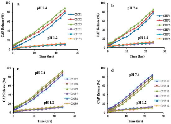 Dissolution studies of the developed formulations (CHF1-CHF12) were conducted in acidic and basic pH to investigate CAP in vitro release rate. Low drug release of 10.47% to 13.65% was revealed at pH 1.2. However, it was enhanced significantly (p < 0.05) at pH 7.4 that was ranged within 75.81–93%, as presented in Figure 10. Release of the drug was markedly affected by the sequential rising of chitosan, fenugreek, MAA, and MBA contents in formulations CHF1-CHF3, CHF4-CHF6, CHF7-CHF9, and CHF10-CHF12, respectively.