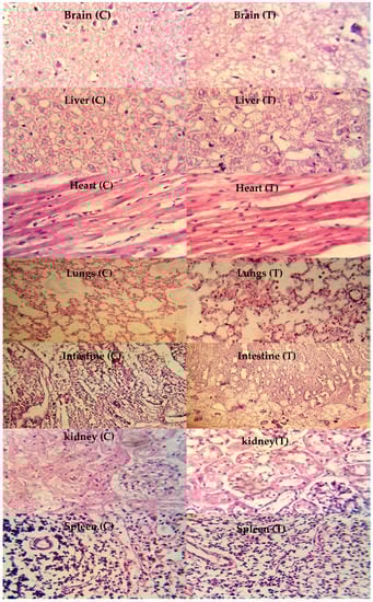 Histopathological examination of rabbit’s vital organs, C: control group and T: treated group, magnification ×40.