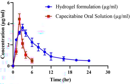 Pharmacokinetic experiments were carried out in healthy rabbits to further investigate CAP’s sustained release response from the grafted network. For this purpose, both groups of animals (B and C) were given an oral solution of pure CAP and optimized hydrogel formulation (CHF9) at equivalent doses, followed by 5–10 mL of water. Values of pharmacokinetic parameters are presented in Table 6, while a comparison of the CAP plasma profile of both formulations is displayed in Figure 12. Drug concentrations in plasma were detected at specified time intervals. In the case of oral solution, the maximum concentration of CAP (Cmax) was noted to be 4.44 μg/mL, achieved within 2 h due to rapid absorption of the drug. These parameters were found to be 3.64 μg/mL and 3 h for hydrogel formulation, respectively. The drug’s half-life was 1.27 h, which was prolonged to 13 h when administered as chitosan/fenugreek-g-poly (MAA) hydrogels. That extended half-life can be explained in terms of the slow release of CAP from polymeric matrix resulting in its sustained effect in plasma and increased bioavailability. Moreover, a significant difference was also revealed within other pharmacokinetic parameters in the case of pure drug and cross-linked network, i.e., MRT of the pure drug (3.02 h) was prolonged to 16.09 h, and AUC was extended from 10.87 µg h/mL to 42.88 µg h/mL. Hence, the chitosan/fenugreek-g-poly (MAA) network system proved to be a suitable and efficient platform for delivering and prolonging the release of CAP and other chemotherapeutic agents, as confirmed by in vivo studies. Hassan et al. (2022) developed chitosan nanoparticles to improve olmesartan medoxomil bioavailability through the nasal route and performed pharmacokinetic studies in rats. They reported a 11.3-fold increase in bioavailability of the drug when administered in the form of nanoparticles, as proved by greater AUC values []. Our work on hydrogels also displayed improvement in the pharmacokinetic parameters of drug.