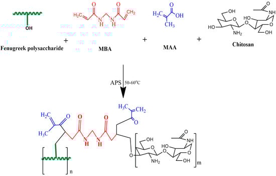 The free radical polymerization technique was employed to synthesize chitosan/fenugreek-g-poly (MAA) hydrogels []. Twelve formulations were developed (CHF1-CHF12), using various proportions of polymers, monomers, and cross-linking agents, as presented in Table 7. Chitosan and fenugreek seed powder were dissolved in acetic acid solution (1% v/v) and distilled water, respectively, using a magnetic stirrer (VELP Scientifica, Milano, Italy) at 110 rpm. After completely dissolving, both polymer solutions were mixed with stirring (120 rpm). APS solution was prepared separately in distilled water followed by addition to the polymer solution with thorough agitation. MAA (monomer) was heated slightly with stirring, then MBA (as a cross-linker) was added to it, and stirring was continued until the solution became clear. The MAA/MBA solution was poured into the polymer mixture, and the final volume was adjusted by the addition of distilled water. The prepared mixture was divided into glass tubes, covered with aluminum foil, and sonicated for 5 min in a digital water bath (WB10-RoHS, VWR International, LLC, Radnor, PA, USA) at 65 °C for 24 h to allow polymerization. Upon solidification, test tubes were taken off of the water bath and then broken carefully to remove the hydrogels, which were divided into small discs, and then they were washed with ethanol and water solution (70:30) for 30 min to remove unreacted contents. Discs were dried in an oven at 45 °C and then at room temperature []. The schematic presentation and proposed chemical structure of the resultant carrier system is presented in Figure 13.
