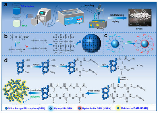The synthesis mechanism of the RSAM is presented in Figure 1d. The SGM was firstly functionalized with amino groups (-NH2) by grafting the APTES onto the framework of the SGM based on the dehydration reaction between the surface hydroxyl of SGM and the hydrolyzed species of APTES. HDI was grafted onto the framework of the SGM by reacting with the amino groups. Along with the HDI molecules that reacted with the amino groups one by one, the polymer chains were formed on the framework of the SGM; thus, the brittle silica framework was coated with robust polyurea chains [33,34]. As a result, the SAM was reinforced by polymer cross-linking.
