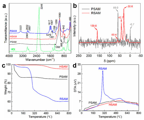 (a) FTIR spectra of SAMs and HDI. (b) Comparative 13C NMR characterization of the PSAM and RSAM. (c,d) TG and DTA curves of SAMs.