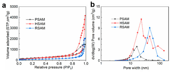 (a) N2 adsorption/desorption isotherms of SAMs. (b) Pore size distribution curves of SAMs.