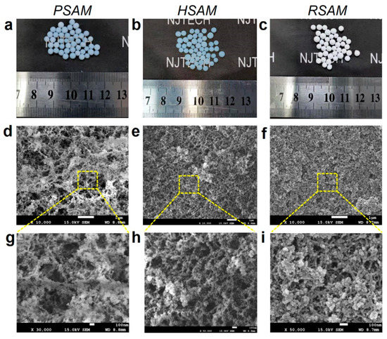 Optical images and SEM images of SAMs: (a–c) Optical images of the PSAM, HSAM, and RSAM. (d–f) SEM images of the PSAM, HSAM, and RSAM with low magnification. (g–i) High magnification.