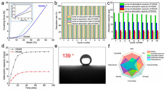 (a) Crushing force–strain curves of the HSAM and RSAM. (b) Desorption rates of the HSAM and RSAM. (c) Cyclic absorption capacities of the HSAM and RSAM. (d) MO adsorption kinetics of the HSAM and RSAM (0.10 ± 0.01 g of sorbent, 10 mg/L MO solution, and 100 and 250 mL MO solution for the HSAM and RSAM, respectively). (e) Water contact angle of the HSAM. (f) Qualitative comparison of typical properties of commercial adsorption materials, PSAM, HSAM, and RSAM.