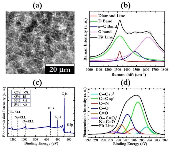 In analogy with previous studies [,], the TEM image of DND powder evidences the presence of closely agglomerated grains which are sized a few hundred nanometers (Figure 1a). The formation of these aggregates is due to the strong tendency to self-assemble typical of DND particles. The Raman spectrum shows the diamond line at ~1325 cm−1 [] the disorder-induced D band at ~1340 cm−1 [,], the graphite G band at ~1590 cm−1 [,], and the amorphous carbon “α-C band” at ~1510 cm−1 (Figure 1b) [,]. The downshifting and broadening of the diamond line, with respect to the Raman mode of single-crystal diamond (1332 cm−1), is a typical feature of nanosized diamonds [,,]. The crystalline quality of the DND particles is evaluated by the calculation of the volume fraction of the diamond phase (), according with the procedure reported in [,]. Taking into account that the ratio between the Raman cross section of amorphous and graphitic carbon with respect to diamond is 233 under the 532 nm laser source, the calculated is around 75%. This finding is consistent with the architecture of DND particles, constituted by a diamond core surrounded by a graphitic shell. Information about the surface chemistry of DND samples is achieved by XPS studies (Figure 1c). By setting the C (1s) photoelectron binding energy at 285.1 eV as a reference for calibrating all the other peaks’ positions, the core levels N 1s and O 1s are found at energies of 401.1 eV and 531.1, respectively. The quantitative analysis of the experimental data provides a surface elemental composition of about 78% of C, 5.5% of N, and 15% of O. Traces of S (<2%) were also detected as residuals of the purification process.