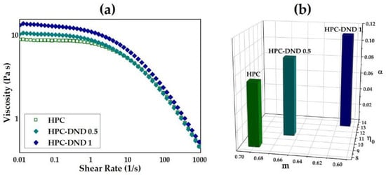 The absence of deviations in the flow curves at high shear rate (Figure 2a) indicates stability and suitability for the use of the hybrid HPC-DND dispersions. As a general trend, from Figure 2a, the viscosity decreases with the increase of the shear rates for all the investigated systems, reasonably due to the progressive uncoiling of the polymer chains bundles []. It is worthy to note that the viscosities of both HPC-DND 1 and HPC-DND 0.5 dispersions exceed that of the refence HPC polymer solution. As shown in Figure 2a, this behavior is especially evident at low shear rates, while for higher shear rates the differences in the viscosities values are more moderate.
