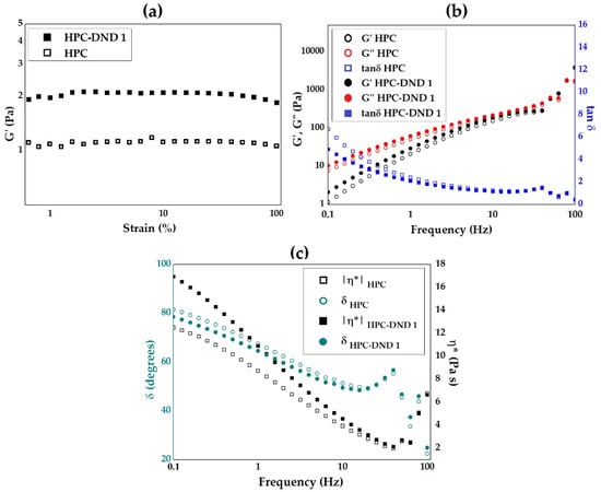 The oscillatory characterization was performed on HPC and HPC-DND 1 samples. Preliminarily, the Linear Viscoelastic Region (LVR), which is defined by a linear relationship between the oscillatory stress (σ) and strain (γ), has been investigated through strain sweep tests, and the obtained data are reported in Figure 3a and Figure S2 of SM.
