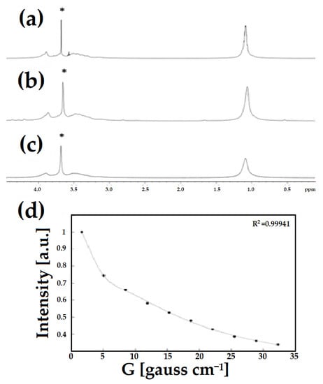 1H-NMR spectra obtained for solutions containing 4% of HPC and (a) 0%, (b) 0.25% and (c) 0.5% of DND. The peak @3.659 ppm marked with * corresponds to dioxane used as an internal standard for diffusion measurements. (d) Relative intensities of HPC-DND peak vs. the gradient strength applied during the diffusion experiment. The fitting was performed using a three-exponential function.