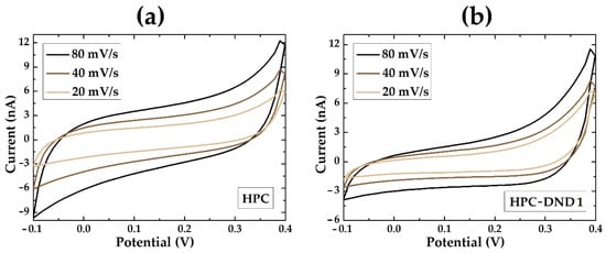 CV of (a) HPC and (b) HPC-DND 1 material at different scan rates (80 mV/s; 40 mV/s; 20 mV/s), voltage range −0.1 V to +0.4 V.