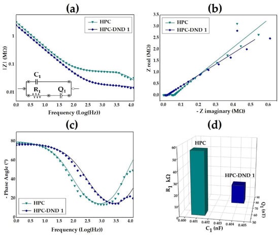 The EIS experimental data are shown in Figure 6. The presence of DND in the cellulose-based material lowers the total impedance value especially in the medium- and high-frequency range (Figure 6a). This result is further confirmed by a parallel analysis conducted without the presence of cellulose, comparing water and water DND dispersion (Supplementary Materials Figure S3). The effect of the diamond is further confirmed also in the Nyquist and negative phase angle plots (Figure 6b,c). The easiest circuit able to fit the EIS experimental data is reported in the inset of Figure 6a. The latter is an adapted form of the Debye circuit which results from the parallel of an ionic resistance (R1) in series with a double layer capacitance (Q1) at the electrode surface and a dielectric capacitance (C1) [,].
