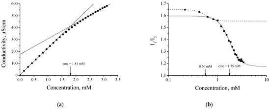 The conductometric titrations were performed by measuring specific conductivities (pH/conductometer Consort C861) over a corresponding range of surfactant concentrations using the initial stock solution of BIBr as titrant. The value for cmc was considered as the abscissa of the intersection point between the two tangents to the linear dependencies of the specific conductivity—surfactant concentration plot before and after micellization.