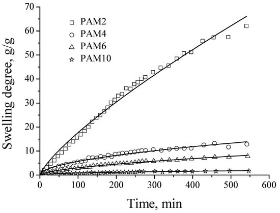 Experimental data together with the fitted curves according to Equation (2) are shown in Figure 3. The model approximates very well especially the data corresponding to the first 60% solvent uptake in hydrogels. As can be seen in Figure 3 and in Table 2, the model fits the experimental data reasonably well over the whole time interval.