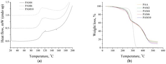 Thermal behavior of dry hydrogels was studied by means of differential scanning calorimetry in order to evaluate the changes in flexibility of polymer chains upon the variable content of crosslinking agent. Surprisingly, the glass transition temperature (Tg) of all copolymers ranged between 105 and 108 °C, almost identical to Tg of uncrosslinked poly(acrylic acid), PAA, namely 105 °C. For exemplification, in Figure 4a the DSC thermograms obtained for three xerogels (PAM4, 6, and 10) are plotted and they show minor differences in glass transition temperatures. Our previous study [] on chemically crosslinked PAA and PAA copolymers obtained via gamma-irradiation showed that both DSC and TG curves were influenced by the absorption dose of radiation, i.e., by the degree of crosslinking. But unlike the gamma irradiation-induced crosslinking, when some additional chemical transformations such as partial decarboxylations accompanied the crosslinkages formation directly between the polymer chains [], in this case the crosslinking process was mediated by BIBr having an overall flexible structure able to preserve almost the same local mobility of the polymer chains in the newly formed network irrespective of the BIBr content or even when compared to the uncrosslinked system. This means that the corresponding Tg values will be very little altered, with tiny differences between them.