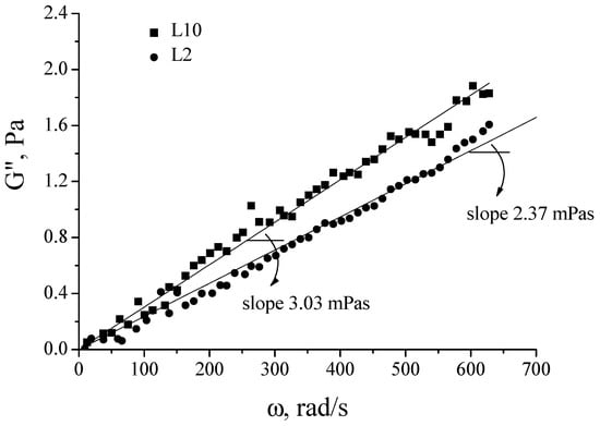 When the same recipes used for preparation of PAM hydrogels were employed for polymerizing an insoluble monomer (methyl methacrylate) via emulsion polymerization, the resulted cationic latexes showed similar macroscopic characteristics no matter the amount of BIBr used. Rheological data revealed a Newtonian behavior for all the prepared latexes, with very similar dynamic viscosities (in the range of 2–3 mPa.s). For better clarity, in Figure 5, the loss modulus (G″) only for latexes L2 and L10 is plotted against angular frequency (ω) and one can notice that for both samples there is a linear dependency of G″ on frequency, which is characteristic to the Newtonian fluids. From the slope of these linear dependencies the dynamic viscosity were calculated, and the obtained values were found to be: 2.37 (for L2), 2.25 (L4), 2.39 (L6), and 3.03 mPa.s (L10).