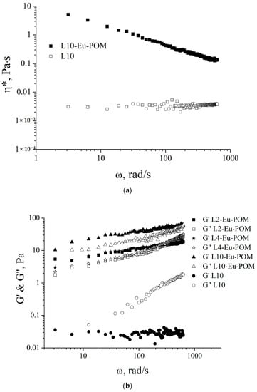 Luminescent latexes obtained after addition of Eu-POM salt displayed much higher viscosities and the rheological behavior changed from Newtonian to pseudoplastic, as can be seen in Figure 6a, where complex viscosity (η*) is plotted against angular frequency, for latex L10 before and after addition of the europium salt. While for latex L10 the complex viscosity is frequency-independent, and has a constant value around 3 mPa.s (the same as dynamic viscosity), for the luminescent latex there is a linear decrease (in a logarithmic scale) of the complex viscosity with increasing the frequency, which corresponds to a pseudoplastic behavior. Additionally, the frequency evolution of G′ and G″ moduli exhibited interesting viscoelastic properties of the investigated latexes with Eu-POM (Figure 6b): the elastic behavior (storage component) prevails with respect to the viscous one (loss component) up to about 200 rad/s (G′ > G″) and then, above this crossover point (ca 200 rad/s), the behavior is reversed (G″ > G′). However, latex L10-Eu-POM is an exception to this general tendency, with a storage component being rather predominant when compared to the energy-dissipative part of the general viscoelastic behavior over the entire range of the angular frequencies applied (G′ > G″). The monotonically increasing course of the loss modulus for the Eu-POM-added latexes, as illustrated in Figure 6b, obeys a low frequency power (G″~ωn), with values less than unity for the power n (n = 1 for a Newtonian flow). This is fully in agreement with the pseudoplastic character of the luminescent latexes investigated.