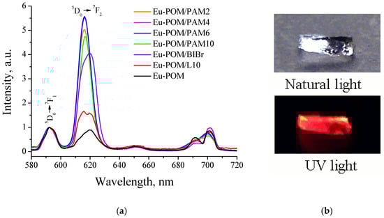 (a) Emission spectra for Eu-POM in different environments (λex = 365 nm), (b) image of PAM10 hydrogel taken in natural and UV light.