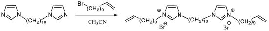 11-bromo-1-undecene (95%, Sigma-Aldrich, Switzerland) and commercial grade solvents were used as received. 1,1′-(1,10-decanediyl) bisimidazole was prepared following literature procedures [], the one used here being described in our previous papers [,,,].