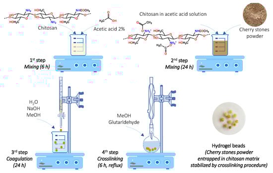 In our case, cherry stones in powder were carefully mixed for 24 h with a solution of chitosan in acetic acid. The suspension was then dripped in a methanol–sodium hydroxide combination and left to rest at 4 °C for another 24 h. The hydrogel beads were heated at reflux in a methanol–glutaraldehyde mixture for 6 h at 70 °C in order to ensure a good stability in acidic media. A schematic representation of the preparation process steps is exhibited in Figure 1.