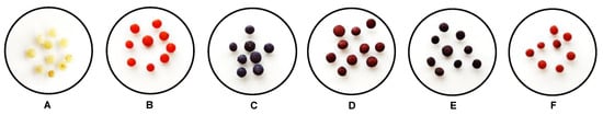 Images of CSCH beads before dye adsorption (A) and after adsorption of AR (B), RB (C), 25% AR + 75% RB (D), 50% AR + 50% RB (E), and 75% AR + 25% RB (F).