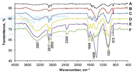 Methylene and methylidene asymmetric stretch have a peak at approximatively 2800 cm−1. In the region of 1500 cm−1–1200 cm−1, bending vibrations of −N−H and of −CH2 can be observed []. At approximately 1000 cm−1, vibration of the C−O of the natural polymer or of cherry stones is visible [].