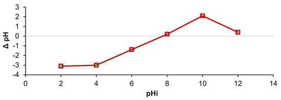 The last investigation conducted for the characterization of the synthesized material was the determination of the point of zero charge (pHPZC). When an adsorbent is introduced in an electrolyte aqueous solution, the ions existing on its surface dissociate and form complexes with those of the electrolyte solution []. Hence, at different pH values, the surface charge can be negative, positive, or null, and the adsorbent acts as a cation or anion exchanger, being able to retain various molecules. A surface charge equal to 0 does not signify the absence of charge but equality between the positive and negative charges [].